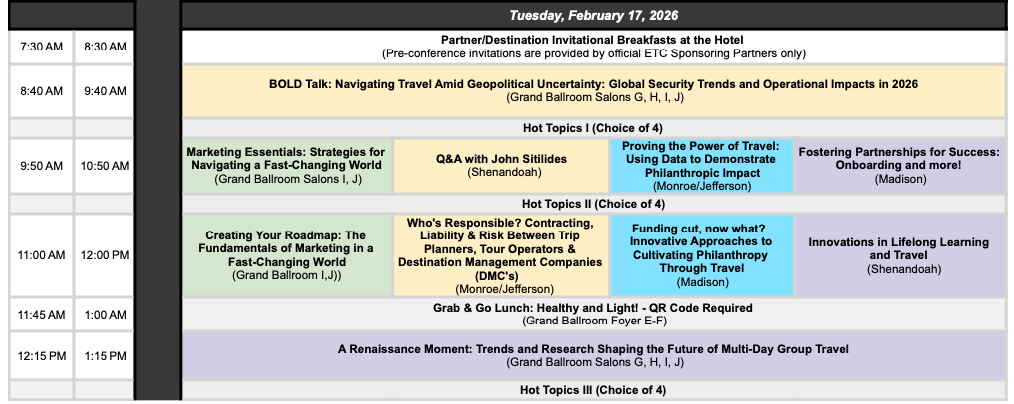 ETC’s annual conference is THE learning and networking event for professionals in educational, experiential and affinity travel. Get new skills, current best practices, shared knowledge and relationship-building all in one place!