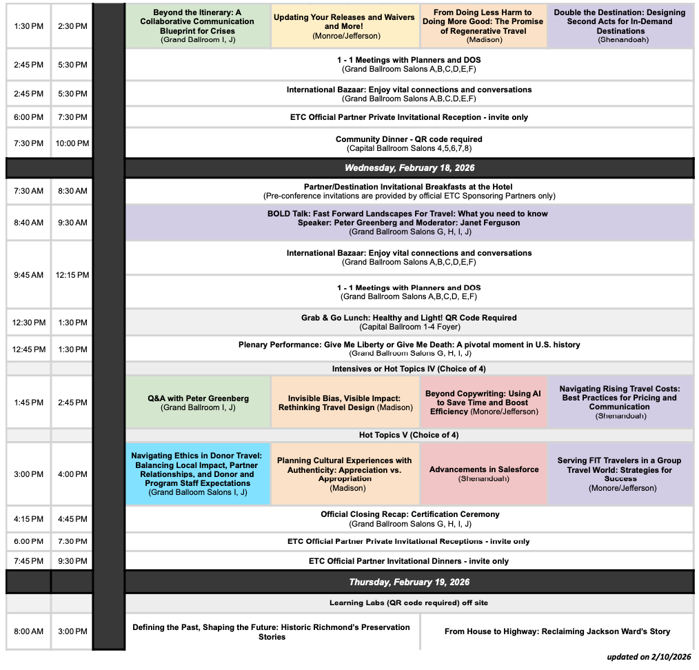 The Richmond Marriott has extended ETC’s discounted conference rates for the weekend prior, and the weekend after, the ETC 2026 Conference. Given the abundance of activities, historic attractions, and dining opportunities available in downtown Richmond, you may consider coming in early – or staying later to enjoy a special weekend for you, friends or family!